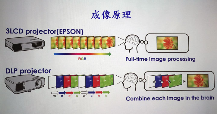 在現場 Epson 的產品經理 Royce 也為大家詳細介紹了投影機技術目前的市場現況,對於消費者來說,採用不同投影技術的產品,所帶來實際成像的效果也各不相同;目前在市場上常見的投影技術基本上可區分為單晶片的 DLP 投影技術,以及 Epson 所採用的 3LCD 投影技術兩大類,其中單晶片 DLP 投影技術採用了單一的色輪來呈現紅、藍、綠與透明四個區域,透過快速重覆顯示的方式來顯示畫面上的色彩,因此在色彩表現上易於失真,且影響投影亮度表現,甚至在高亮度或全暗畫面時容易出現紅綠藍三色光閃爍痕跡的「彩虹效應」。