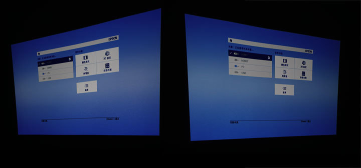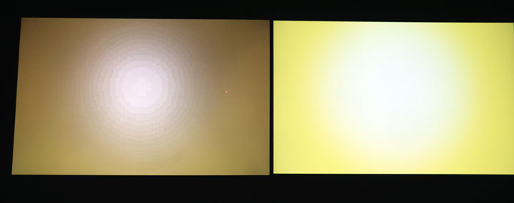 圖:上圖也可以明顯看出 DLP 投影技術與 3LCD 投影技術的差異,圖左的 DLP投影機所投射出來的黃色漸層區塊因為亮度不足,已經是接近土黃色調,漸層的斷階也很明顯,相較之下圖右的 3LCD 投影技術在色彩還度與漸層表現都更為優異。