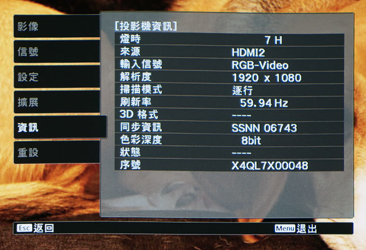 圖:在「資訊」功能分頁中,可看到 EH-TW5400 目前的使用狀態,包括燈泡使用時間、目前使用的訊號源、解析度、掃描模式、刷新率…等。