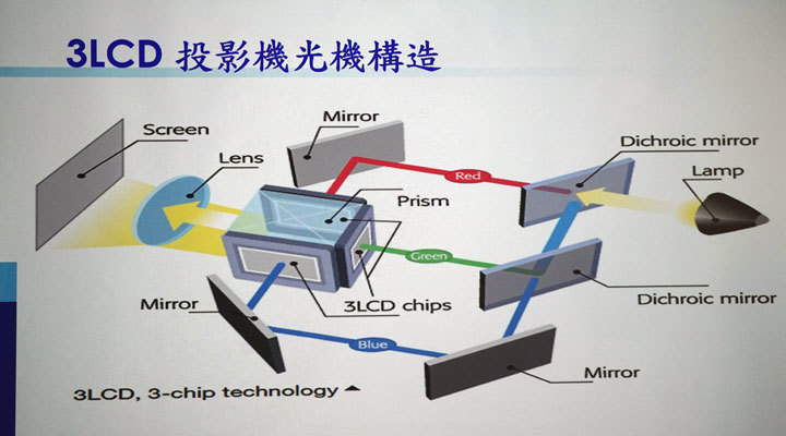 圖:3LCD 投影機內部具備三片獨立的 LCD晶片分別顯示 RGB三色,並即時透過內部的反射鏡聚合呈像,透過鏡頭投影,因此顯色更為純淨。