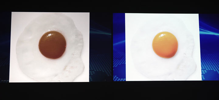 圖:不知道上面投影出來的荷包蛋,哪一個看起來比較美味呢?圖右為 3LCD 投影技術所投射出來的影像,明顯可以看出 3LCD 在彩色亮度上的優勢。