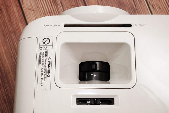 圖:機身頂部,靠近鏡頭側可以看到可同步關閉鏡頭蓋與停止訊源輸出的「A/V Mute」開關,方便使用者在不關閉投影機的狀態下停止影像輸出,在臨時要停止觀看投影內容時,這個功能就十分方便,不需要頻繁進行投影機的開關。另外也可以看到鏡頭的手動變焦/對焦撥桿,以及可快速進行水平梯型修正的撥桿。