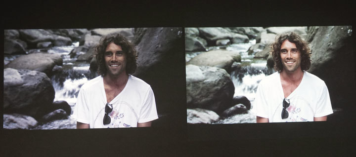 圖:現場也展示了 DLP 技術(圖左)與 3LCD 技術(圖右)投影相同的訊號源,可以明顯發現在色調方面 DLP 投影機呈現的影像整體較為黯淡,而 3LCD 投影機的色調更接近戶外自然光的場景,人像的膚色也更自然。