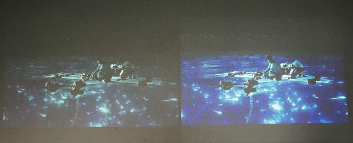 圖:接下來我們透過電影「少年Pi的奇幻飄流」中知名的場面:每面出現發光浮游生物的美麗場景,可以看到圖左的 DLP 投影機投射的畫面色彩已經完全失真,相較之下 3LCD 投影機投射出來的是亮麗的藍色,大家另外也可以看到海面上呈現出更多細節。