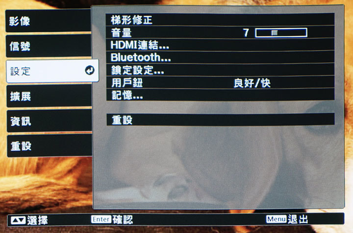 圖:在「設定」功能分頁中,可以看到梯型修正、音量調整、HDMI 連結與藍牙連結等設定。
