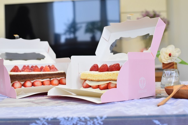 蛋糕才從提袋拿出來盒子還沒有打開就可以聞到撲鼻而來的草莓香氣