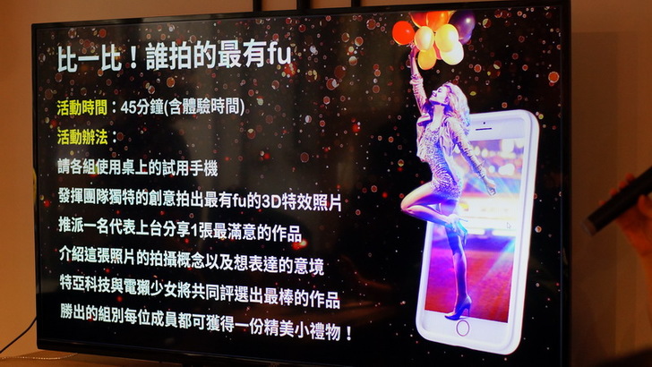 東西再好,也要實際試看看,接下來開放45分鐘讓大家拿起體驗機試著拍幾張3D照片,等一下每一組要推派一名代表介紹自己拍的3D照片,拍得最好的那一組可以得到獎勵。