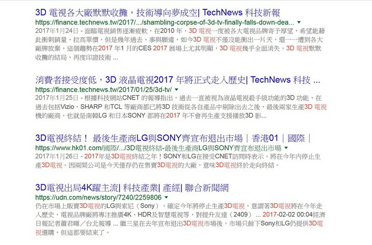 在同一時間裡,3D技術氣勢正旺的時候,各家電視大廠也沒閒著,貴森森的3D電視也推出了,一台3D電視開價台幣10多萬,然後送你幾個3D專用眼鏡,讓你不用到電影院也可以在家看3D電影。聽起來也不錯啊,雖然開價很貴,但是長期攤提下來,一家四口一個月看一部3D電影就好,3D電視的成本沒幾年就回來了啊。但是,人生怕的就是這個但是,在家觀賞3D的效果一樣不好,家庭用設備哪可能贏過商業用設備呢?戴眼鏡有人會頭暈的問題還是沒解決,最慘的是,如果沒有片商繼續投資3D影片,一部阿凡達你是打算看幾次?(但周星馳的電影我可以一看再看),我記得2010年的時候,被很多人稱為3D元年,3D相關科技業百花齊放,那現在呢?還是有人在3D方面努力啦,但是3D電視已經在2017年收攤啦,轉而向高畫質4K,8K與HDR努力。