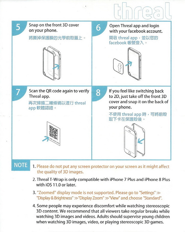 threal 3D 拍照手機殼安裝方式極為容易,僅需兩個簡單動作,就可輕鬆體驗 3D 拍照的新奇快感!首先,將 threal 3D 拍照手機殼套上你的 iPhone 7 plus / iPhone 8 plus/ iPhone X;接著到 App Store 下載安裝免費 Threal APP。