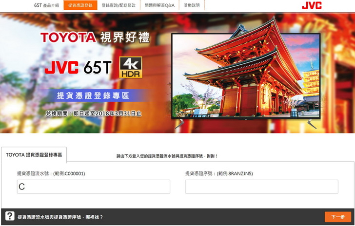 上網輸入序號和流水號登入,登記個人資訊和地址、配送日期,不過因為小弟前一陣子忙就忘了抓圖,和之55T的表格差不多,目前大約要等8至10天左右就會收到了,另外還要選包材回收(不選回收要留包材的話要收500元)、安裝壁掛要加錢,原廠壁掛架+施工3000,只要掛架的話1000,(價格不確定,小弟無法回去查詢了,只是憑印象打出來,若有錯還請指正)