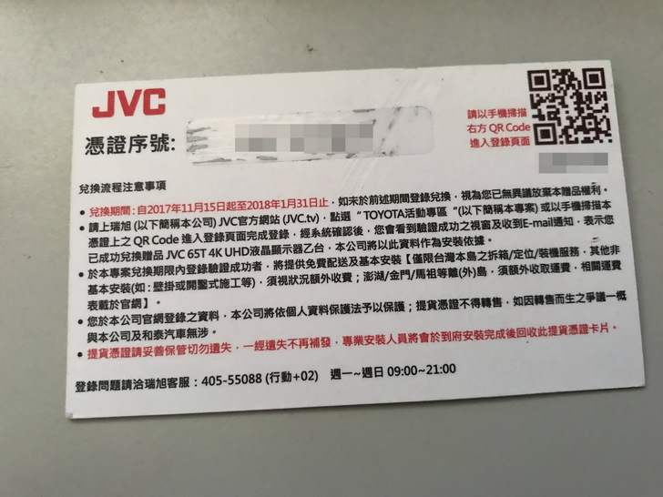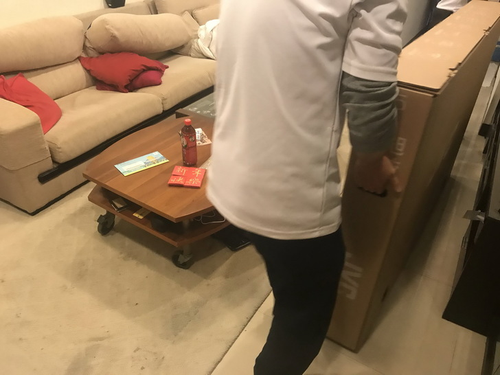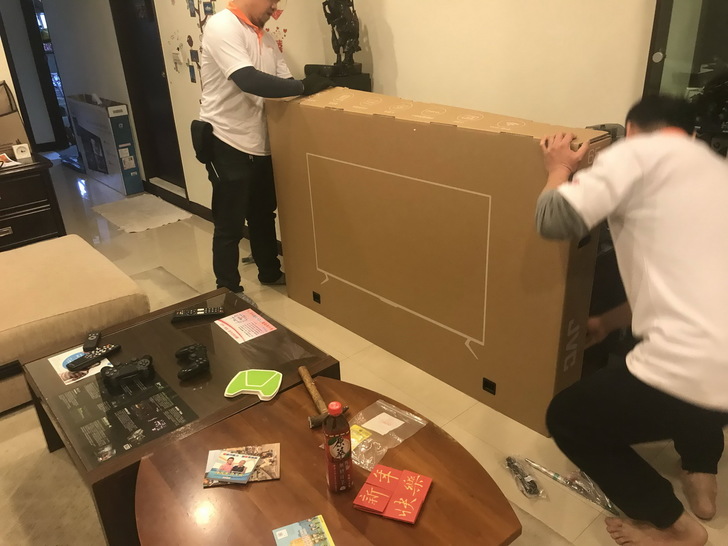送貨大哥這次不是一個人了 XD,這次是兩個人,也是啦,這麼大一台真的要兩個人配合安裝比較快,不過這次的安裝人員比較冷淡,就快速裝好到位,另一位就拿箱子下去了,剩一位測試、收兌換券和請你簽單子,問了一下保固是要登錄才有三年嗎?一律回答打客服……(之前的55T是要登錄才有原本的18再+18個月保固),後來上網看才知,他們排好送貨日期後就是從今天開始算保固36個月了
