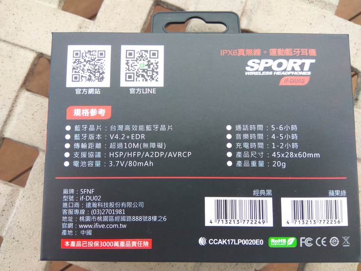 ▲盒裝正面為if-DU02本體。真無線目前大約粗分二種類型,一種是無耳掛的,if-DU02則是有耳掛。另外,可看出if-DU02具有IPX6防水性能。該防護等級為可抵擋來自各方向的高壓噴水,看來一般汗水、雨水是沒問題的。