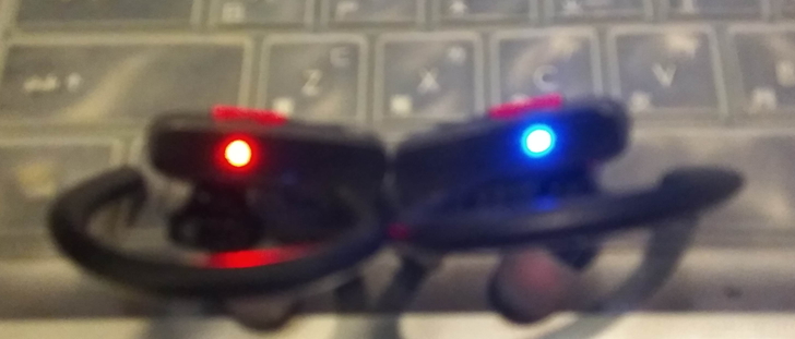 ▲充飽電後,就要開機配對了,在if-DU02上方會有紅、藍二色指示燈供參考。要注意,開機要二耳同時按多功能鍵才會自動雙耳配對。關機時,關任何一耳,二耳都會關閉。