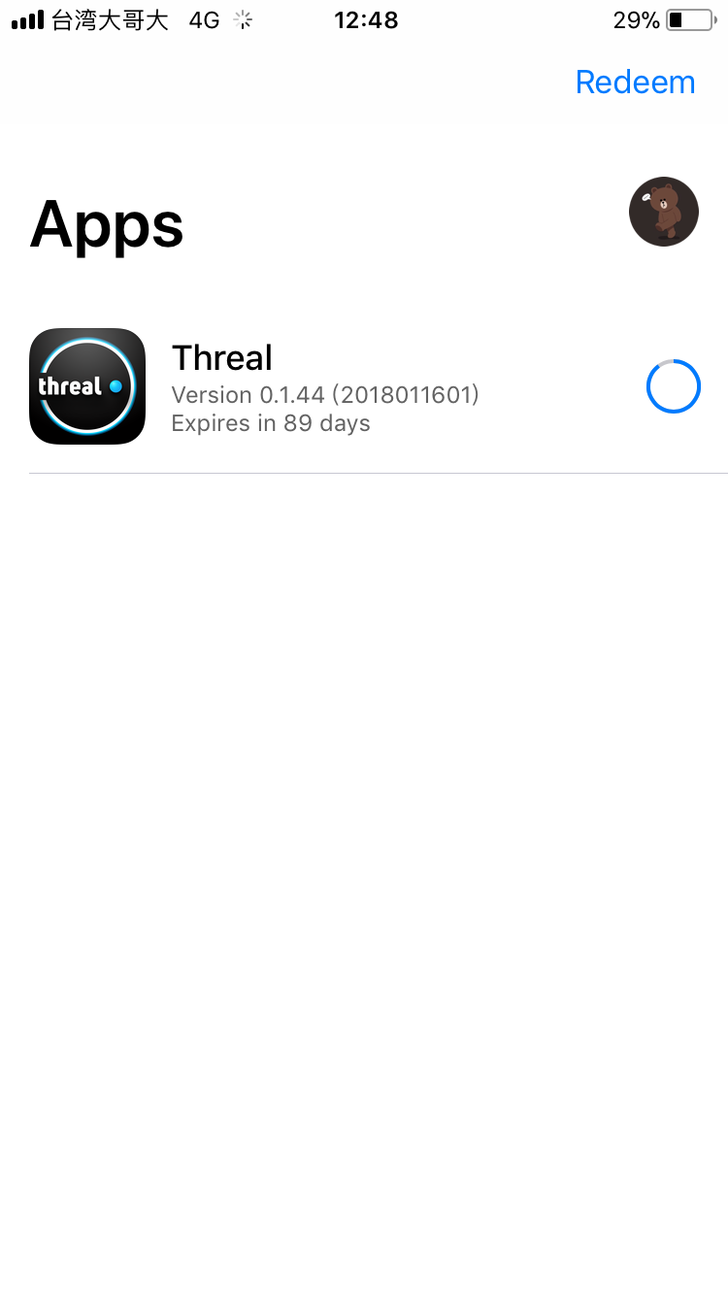 ▲ 開啟 TestFlight,點選右上方 Redeem,輸入 Redeem Code. 即可進行 Threal App下載作業