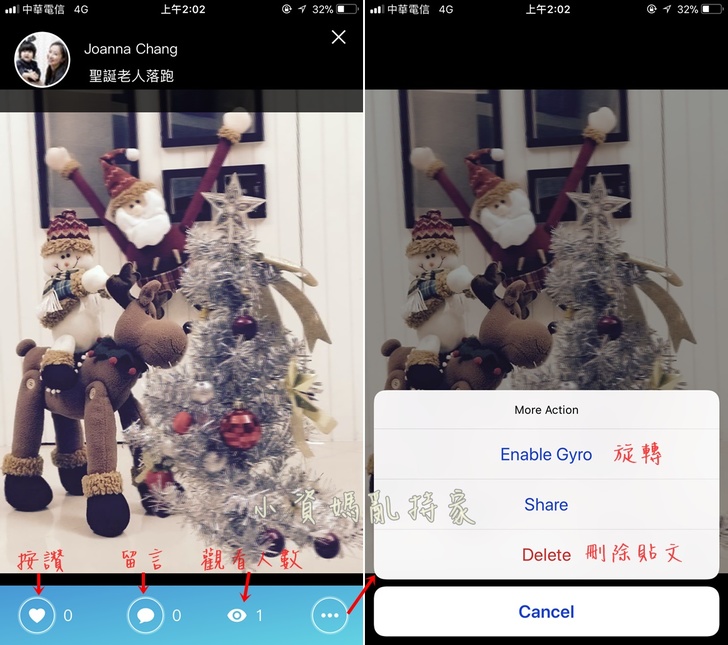 其中比較特別的是Gyro這個功能,我查google這個字的意思是陀螺儀,簡單講就是按下去後可以在一個有限的角度內旋轉照片
