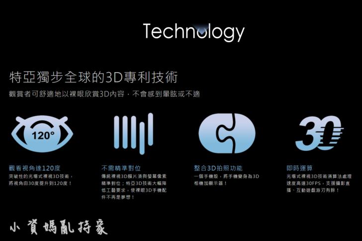 而特亞科技突破性的光場式裸視3D技術,不只解決了暈眩問題,更將視角從一般的30度提高到120度,也就是不需要在螢幕正前方也一樣能看到3D效果