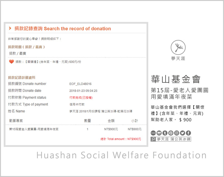 感謝1月份參與的學員們,這個月真的是被學員追著跑呢!如此上進求學與渴望的精神,讓夢天涯非常佩服不已,這次課程招收了23位學員(包含3未到場學員,完成品已寄到學員手中),本月公益活動夢天涯選擇 〝唐氏症基金會〞 與 〝華山基金會〞,唐氏症基金購買愛心手工餅乾,並發送於當天上課學員,華山基金會我們選擇【關懷禮】(含年菜、年禮、元宵)幫助老人家。