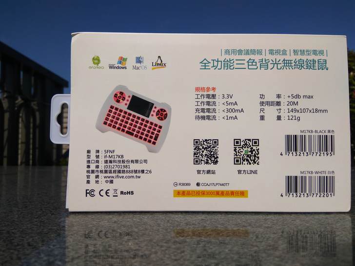 ▲盒裝背面,為if-M17KB產品規格。而個人認為最重要的是,它支援目前常見的作業系統,MAC、WINDOWS、ANDROID、LINUX。