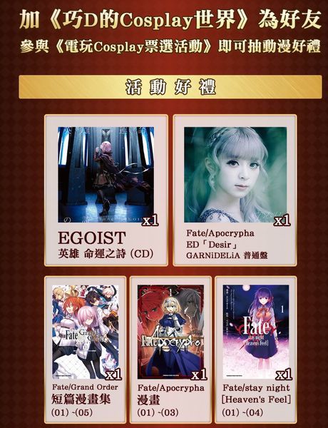 獎品好像都是Fate相關的就是了…對型月迷來說應該還是頗吸引的吧,還有一些Mycard點數、第一次COS比賽前三名的明信片。