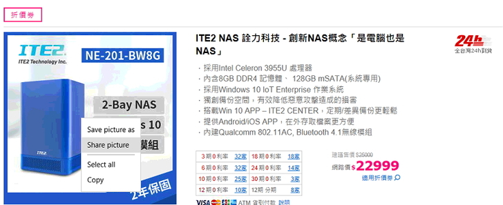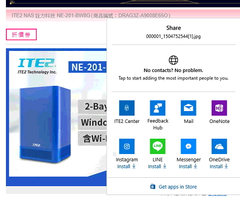 ▲ 在 Microsoft Edge 瀏覽器中,若看到有想要分享的照片,祗要在其照片上方,按滑鼠右鍵,選取分享照片,即可透過 ITE2 Center 分享