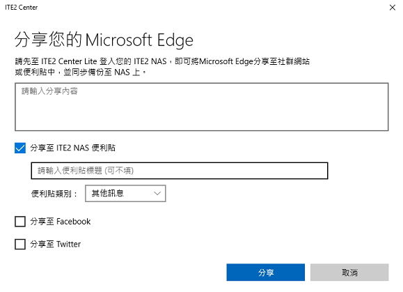▲ 輸入欲分享的文字訊息,以及想要分享的平台,然後選取【分享】,完成整個作業