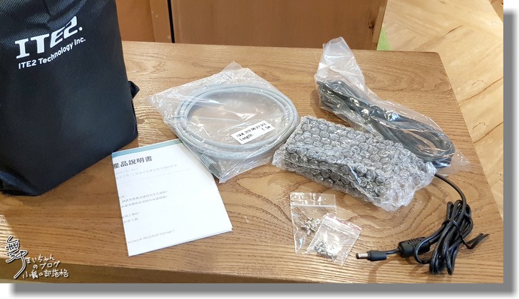 ▲立馬開箱,除了ITE2 NE-201主機外,另外還有簡易操作指南、網路線、變壓器、電源線、以及2組硬碟支架螺絲。