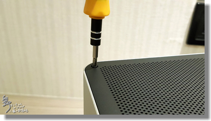 ▲準備十字螺絲起子來打開頂端蓋子,這裡有個小插曲,因為鎖住上蓋的螺絲尺寸較小,家中的2款普通大和普通小的螺絲起子都不合規格,所以又拖了兩天去找了更小尺寸的起子才順利打開,所以有購買這款NAS的使用者要稍留意一下。
