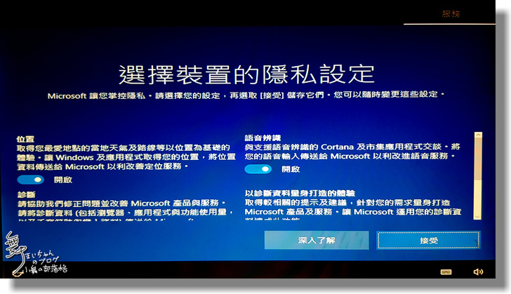 ▲接著設定《隱私設定》選項後,就差不多完成Windows 的初始化設定