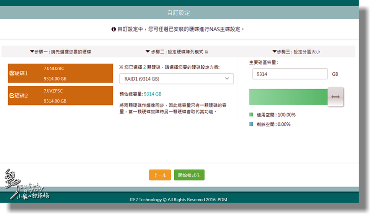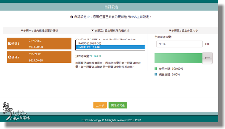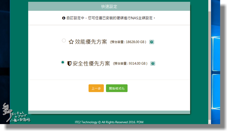 ▲如果選擇《快速設定》,PDM依安裝的硬碟數量提供以效能優先還是以安全優先的選項,說簡單就是要選擇磁碟陣列是RAID 0或RAID1的方式。