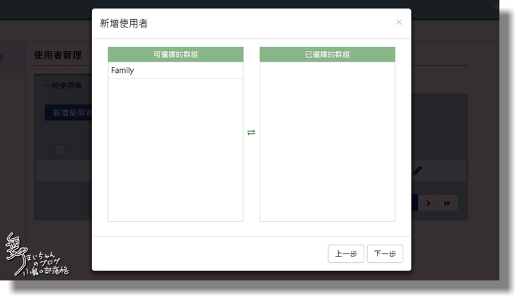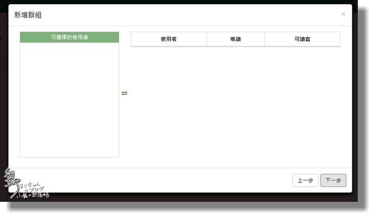 ▲接著請點選欲加入此群組的使用者,勾選使用者加入群組並設定其權限,勾選完畢後點選[下一步]。