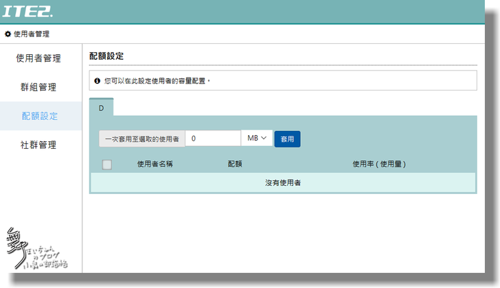 ▲在配額設定中,可以檢視並設定各別使用者的配額,,只要點選使用者的配額欄位即可設定使用者的最大容量配額。