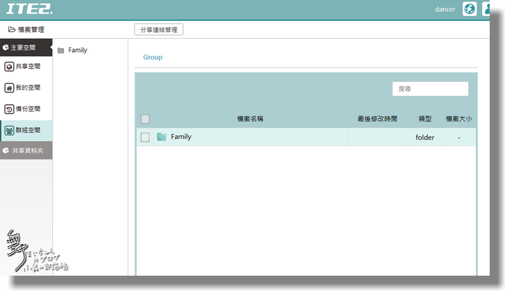 ▲『群組空間』則是使用者群組專享的空間,這在提供不同的使用者,例如同事、同學或家人等非常方便,能切開公私不同的使用者可存取的文件權限。