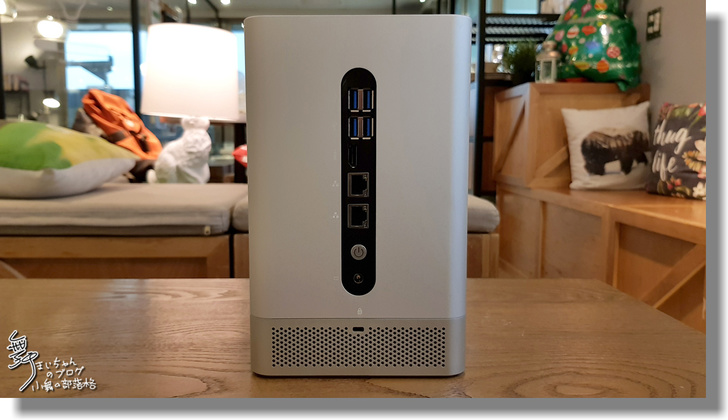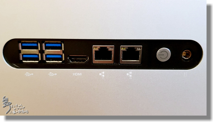 ▲背後的介面詳圖:有著USBx4、HDMI埠、RJ45x2、天線擴充插槽;雖然是Windows電腦,但還是一台NAS,所以電源開關在背面雖然好像不方便,但想到NAS幾乎不關機,也就沒什麼差了。