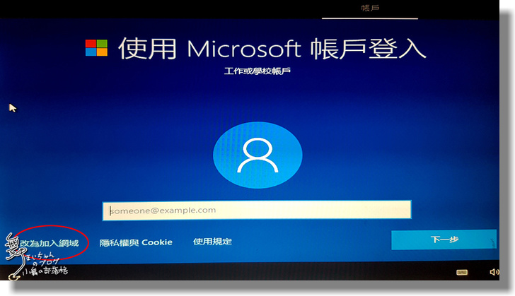 ▲然後需要設定Microsoft帳戶,這裡要特別注意不要像我笨笨的填寫自已的Microsoft帳戶,需要選擇左下角的《改為加入網域》才行,因為NE-201僅支援網域使用者帳號,因此需使用網域帳號。