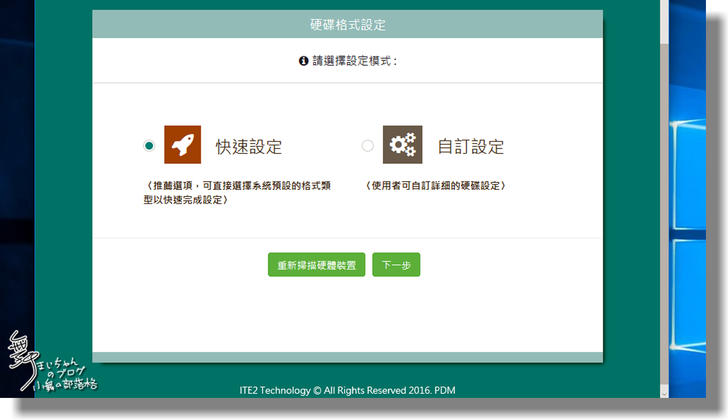 ▲登入後系統會要求設定硬碟格式,可選擇《快速設定》或《自訂設定》兩種設定方式。