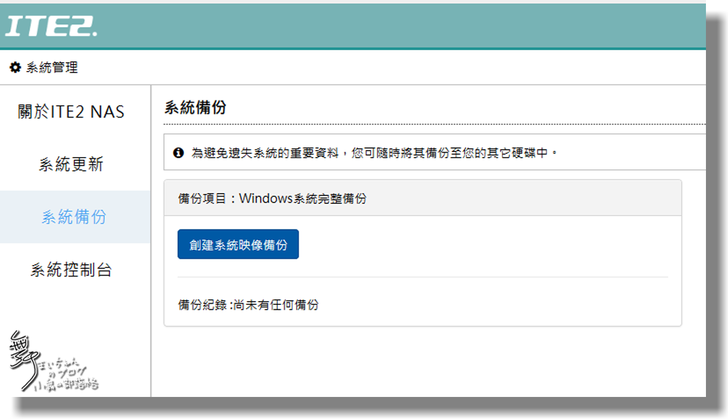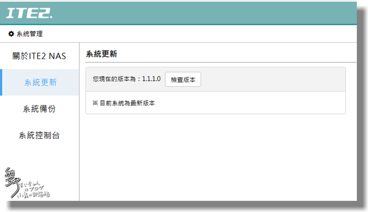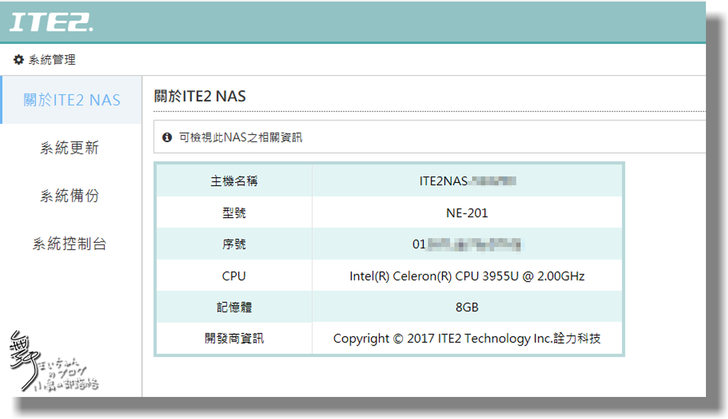 ▲關於 ITE2 NAS:可以檢視 NAS的主機名稱、型號、序號、CPU、記憶體和開發商資訊。
