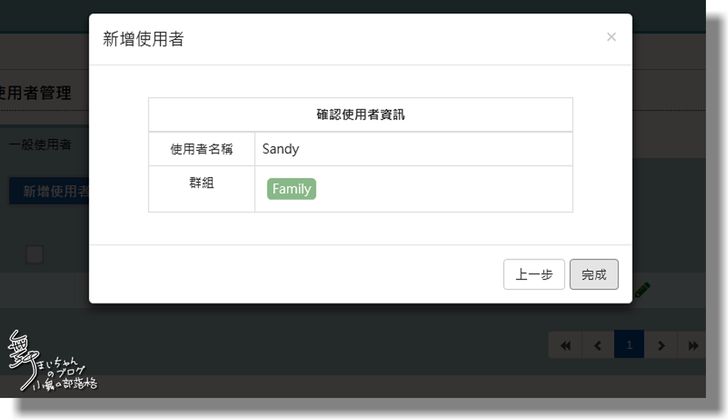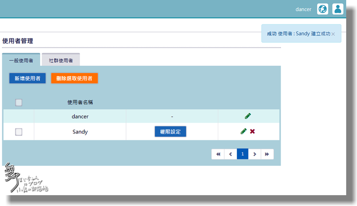 ▲這時在使用者清單就能看到剛創建的新使用者,右上也會彈跳建立成功的訊息。