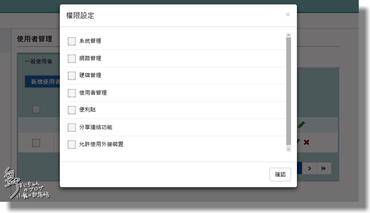 ▲而該帳號的權限則可以在使用者清單中的選單中去定義,只要透過勾選就可以完成增減設定。
