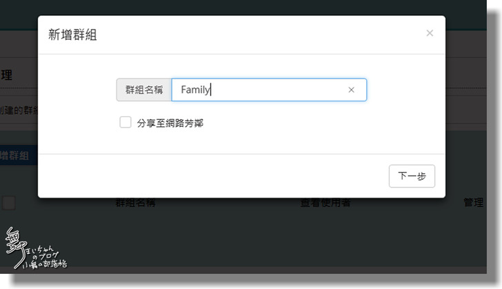▲透過新增群組方式來增加所管理的群組,按下「新增群組」至新增群組頁面,輸入群組名稱及設定是否開啟網路芳鄰。