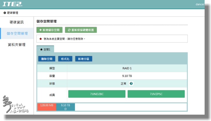 ▲《儲存空間管理》可針對硬碟設定分區,刪除或格式化處理NAS的儲空間