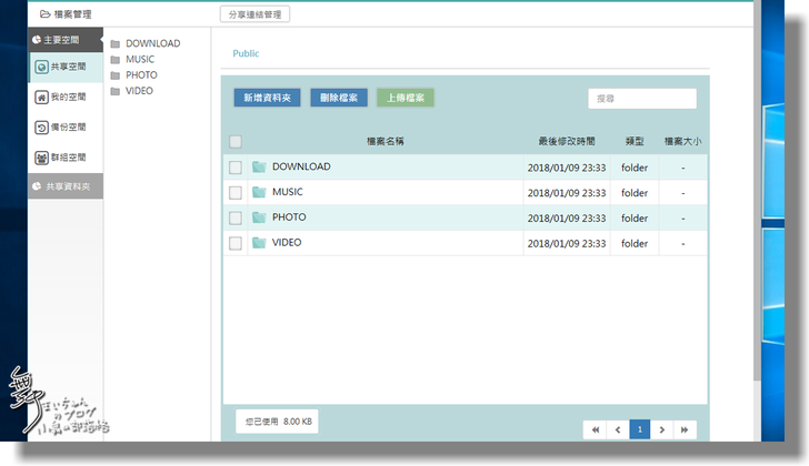 ▲檔案管理方面,主要空間區分為『共享空間』、『我的空間』、『備份空間』與『群組空間』 4 大類,其中『共享空間』可以讓群組使用者進行存取。
