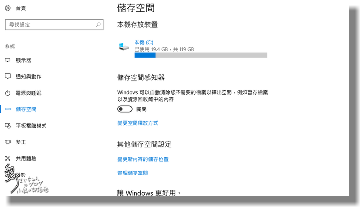 ▲系統內建128GB SSD,安裝完Windows10企業版後,還有119GB可用。