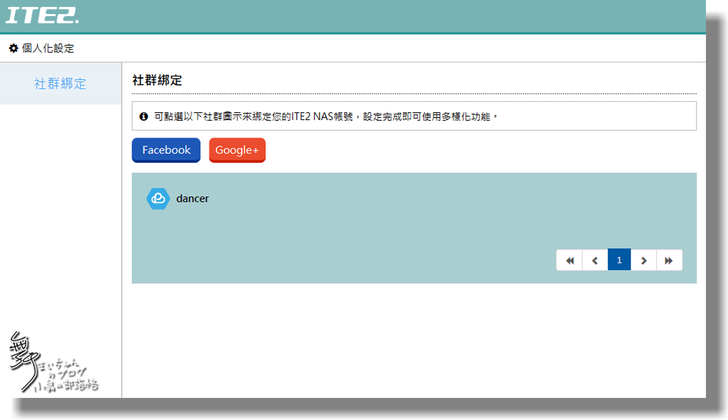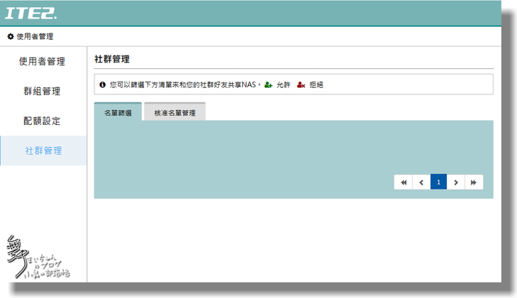 ▲在ITE2 NAS 中,提供獨家的社群整合服務,可以利用個人化設定功能來開放管理者的社群好友登 入到 NAS,達到社群空間共享的效果,所以在社群管理中,審核您的社群好友,審核通過的社群好友就可以直接登入使用 NAS。