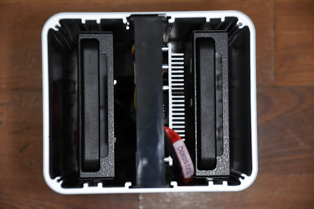 ▼ 泡棉拿掉後,詮力科技 ITE2 NAS NE-201 內部一覽無疑,中間是主機板和 CPU 所在的位置,左右兩邊各有兩個放硬碟用的卡槽。