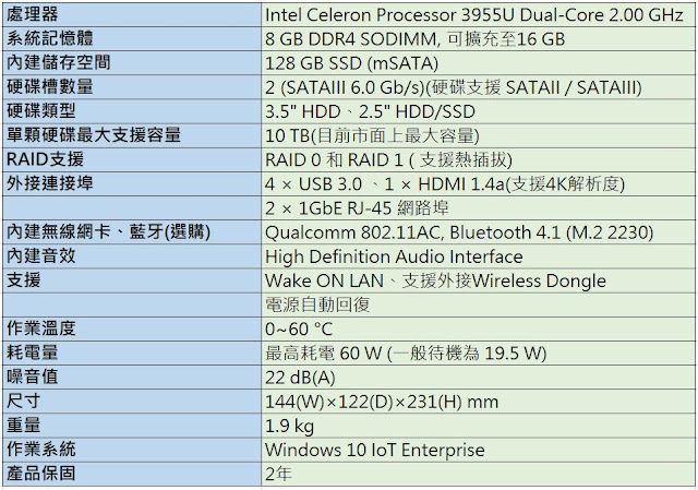 ▼ 底下就是詮力科技 ITE2 NAS NE-201的硬體規格表,大家可以看看,基本上 NE-201 規格是 Intel Celeron 3955U 雙核 2.00 GHz 的 CPU(和市售他牌 NAS 相比,這 CPU 等級可以說是最好的)、內建 128 GB SSD 硬碟(Window 10 電腦系統用硬碟)、8GB 記憶體(最高可升級到 16GB)、具有兩個 1 GbE RJ45 網路埠、支援 RAID 0/1、內建無線網路、內建 Wndows 10 IoT Enterprise 系統、2 bay 設計的 NAS (可以插兩顆硬碟,支援目前所有市售硬碟容量)、耗電功率最高 60 W(一般使用約 19W)和淨重只有 1.4 公斤和全機身金屬外殼。以 NAS 規格而已可以說是非常有誠意了。