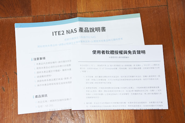 ▼ 詮力科技 ITE2 NAS NE-201的簡易產品說明書(教你如何設置系統和安裝硬碟),同時因為內建正版 Window 10 Enterprise 版本,所以有再附上一張軟體授權書。