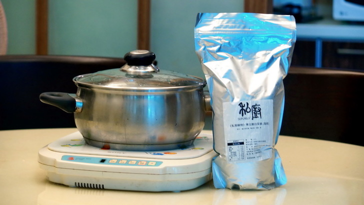 別小看這包湯底,拿起來是很有份量的,拿鍋子與電磁爐當作尺寸參考,你就知道大小了。