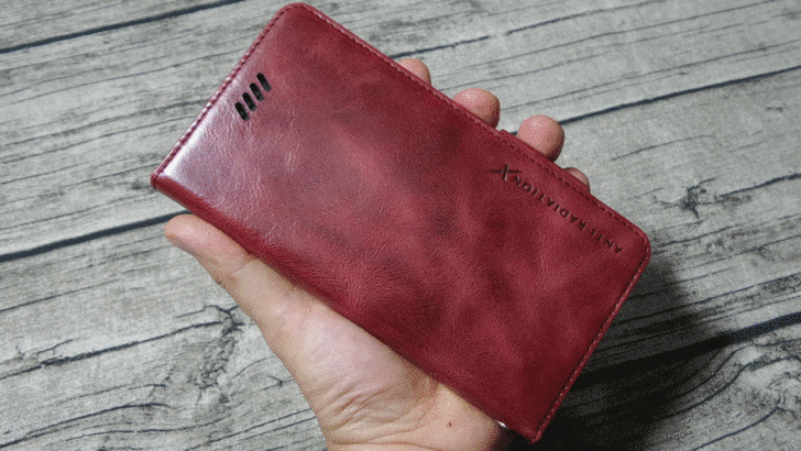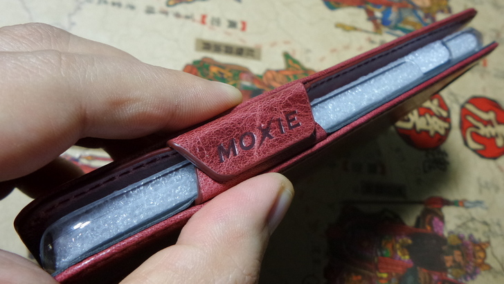 【▼】由於MOXIE摩新 for iPhone6/6S Plus的手機皮套有黑色、巧克力棕與酒紅色,小編搭配的iPhone屬玫瑰金,所以就選相似的酒紅色皮套,這酒紅色不是恆一的色澤,而是像酒杯中搖晃的紅酒有漸層的深淺層次。正面引有防電磁波的ANTI-RADIATION英文字樣,背面則印有MOXIE Logo與Protecting Your Healthy Life保護你的健康生活。