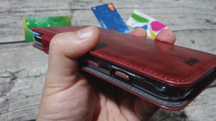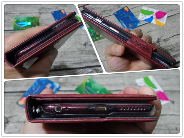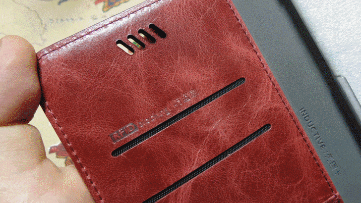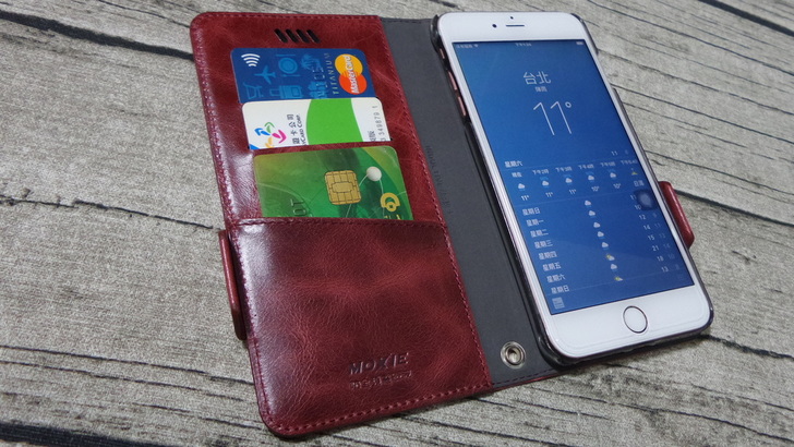 【▼】皮套內層的口袋有三個卡片夾層,上面兩個尺寸為標準卡片大小長8.57公分,寬5.4公分,而下方夾層較大,可以擺入其他信用卡防側錄,因為有隔絕防護材質的關係,插入其中的信用卡便不會被感應到電磁波進而被盜刷。而側邊其實也是個感應夾層,由於是放在隔絕材質的底下,蓋上之後仍能使用感應的功能。由於悠遊卡本身使用的技術RFID是經過感應器讀取的,自身不會發出電磁波,所以即使是裝在皮套沒有隔絕的位置,還是可以安心使用,不必擔心電磁波的影響。不過整體上建議不要放太多張,免得造成外蓋無法閉合的現象。