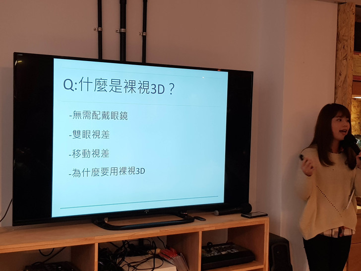 體驗當天有些下雨,我們到的時候已經開始了,只能坐在後面從中間開始聽:為什麼紅極一時的3D會落到如今的局面,當然跟市場反應是有關的,廠商們主打3D功能,但是消費者卻不買帳,3D功能既然無法有效提升銷售量,自然就變成非必要的功能,但是3D為何會變得如此,除了價格因素外,3D看久了會感覺不舒服也是主要原因,目前觀賞3D大多數還是要依靠主動式眼鏡,不過看久了會有點頭暈的感覺(我自己就是如此),也因為如此我自己連3D電影都很少看,就算有大作,在電影院看一半有時還會把眼鏡取下來休息一下。最後還有家用市場3D的訊源過少也是主要原因,消費者花大錢買了3D投影機、主動式眼鏡,卻只有少數的片源可以觀看,CP值實在不高,這一切都限制了3D的發展。而裸視3D則不同,因為無須特殊設備,僅僅用雙眼就可以觀看3D效果,觀看的門檻低了很多;還有裸視3D也比較不會有看久了眼睛不舒服的問題